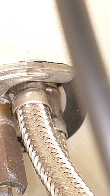 洗面台の収納スペースで排水や蛇口、給水管をお調べしました。すると30秒に1滴くらいのペースで蛇口下部から水漏れを起こしており、蛇口から水を流さなくても水漏れをしている状況でした。